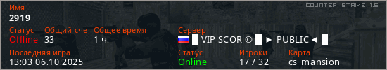 Играет на Counter Strike 1.6 сервере. Страна: РоссияПервый раз замечен 19:47 07.09.2025