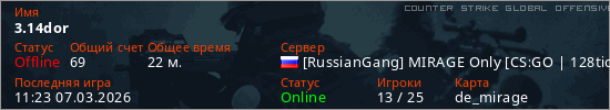 Играет на Counter Strike Global Offensive сервере. Страна: РоссияПервый раз замечен 01:45 07.03.2026