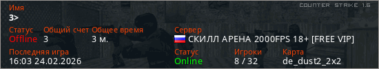 Играет на Counter Strike 1.6 сервере. Страна: РоссияПервый раз замечен 16:03 24.02.2026
