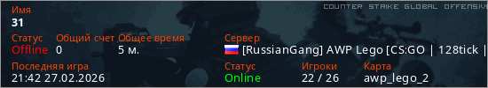 Играет на Counter Strike Global Offensive сервере. Страна: РоссияПервый раз замечен 21:37 27.02.2026