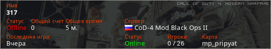 Играет на Call of Duty 4: Modern Warfare сервере. Страна: РоссияПервый раз замечен 20:17 01.02.2026