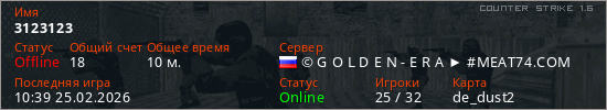 Играет на Counter Strike 1.6 сервере. Страна: РоссияПервый раз замечен 10:19 25.02.2026