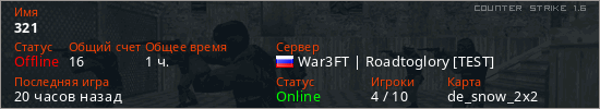 Играет на Counter Strike 1.6 сервере. Страна: РоссияПервый раз замечен 13:09 26.11.2025