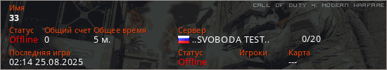 Играет на Call of Duty 4: Modern Warfare сервере. Страна: РоссияПервый раз замечен 02:12 25.08.2025