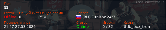 Играет на Team Fortress 2 сервере. Страна: РоссияПервый раз замечен 17:49 27.03.2026