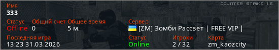 Играет на Counter Strike 1.6 сервере. Страна: УкраинаПервый раз замечен 13:21 31.03.2026