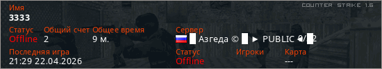 Играет на Counter Strike 1.6 сервере. Страна: РоссияПервый раз замечен 20:51 22.04.2026