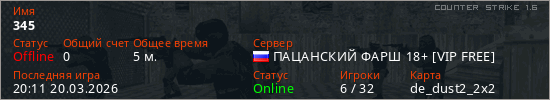 Играет на Counter Strike 1.6 сервере. Страна: РоссияПервый раз замечен 19:42 20.03.2026