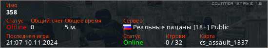 Играет на Counter Strike 1.6 сервере. Страна: РоссияПервый раз замечен 20:41 10.11.2024