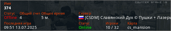 Играет на Counter Strike 1.6 сервере. Страна: РоссияПервый раз замечен 09:45 13.07.2025