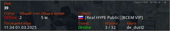 Играет на Counter Strike 1.6 сервере. Страна: РоссияПервый раз замечен 11:32 01.03.2025