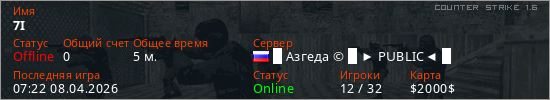 Играет на Counter Strike 1.6 сервере. Страна: РоссияПервый раз замечен 07:20 08.04.2026