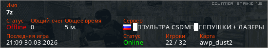 Играет на Counter Strike 1.6 сервере. Страна: РоссияПервый раз замечен 20:44 30.03.2026