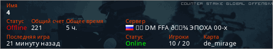 Играет на Counter Strike Global Offensive сервере. Страна: РоссияПервый раз замечен 19:45 24.02.2026
