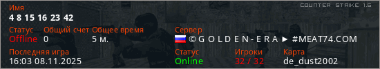 Играет на Counter Strike 1.6 сервере. Страна: РоссияПервый раз замечен 15:57 08.11.2025
