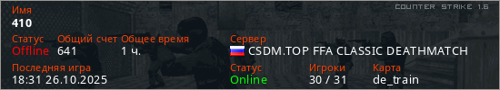 Играет на Counter Strike 1.6 сервере. Страна: РоссияПервый раз замечен 14:01 22.01.2025