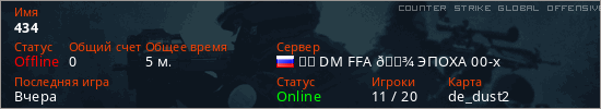Играет на Counter Strike Global Offensive сервере. Страна: РоссияПервый раз замечен 17:54 23.02.2026