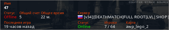 Играет на Counter Strike Source сервере. Страна: РоссияПервый раз замечен 18:33 30.11.2025