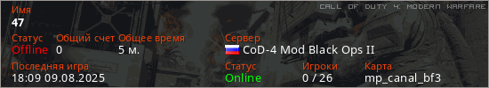 Играет на Call of Duty 4: Modern Warfare сервере. Страна: РоссияПервый раз замечен 18:07 09.08.2025