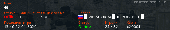 Играет на Counter Strike 1.6 сервере. Страна: РоссияПервый раз замечен 20:40 21.01.2026