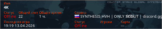 Играет на Counter Strike Global Offensive сервере. Страна: РоссияПервый раз замечен 12:45 04.04.2026