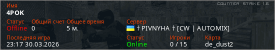 Играет на Counter Strike 1.6 сервере. Страна: УкраинаПервый раз замечен 22:38 30.03.2026