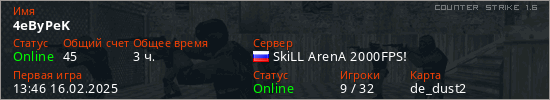Играет на Counter Strike 1.6 сервере. Страна: РоссияПервый раз замечен 13:46 16.02.2025