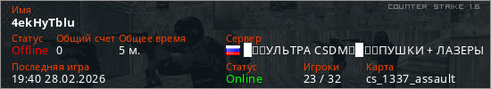 Играет на Counter Strike 1.6 сервере. Страна: РоссияПервый раз замечен 19:36 28.02.2026
