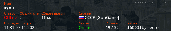Играет на Counter Strike 1.6 сервере. Страна: РоссияПервый раз замечен 15:58 16.03.2025