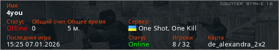 Играет на Counter Strike 1.6 сервере. Страна: УкраинаПервый раз замечен 14:15 07.01.2026