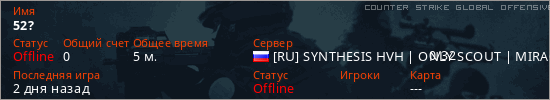 Играет на Counter Strike Global Offensive сервере. Страна: РоссияПервый раз замечен 19:59 07.03.2026