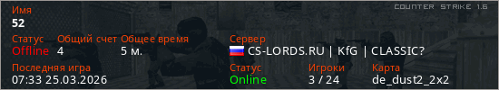 Играет на Counter Strike 1.6 сервере. Страна: РоссияПервый раз замечен 07:31 25.03.2026