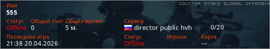 Играет на Counter Strike Global Offensive сервере. Страна: РоссияПервый раз замечен 21:36 20.04.2026