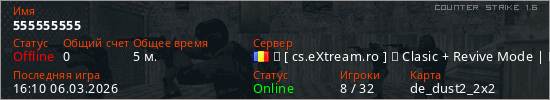 Играет на Counter Strike 1.6 сервере. Страна: РумынияПервый раз замечен 16:08 06.03.2026