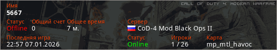 Играет на Call of Duty 4: Modern Warfare сервере. Страна: РоссияПервый раз замечен 22:51 07.01.2026