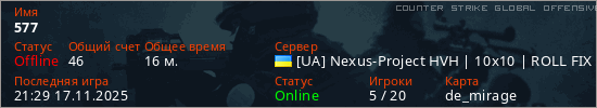 Играет на Counter Strike Global Offensive сервере. Страна: УкраинаПервый раз замечен 20:24 17.11.2025