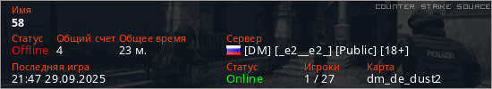 Играет на Counter Strike Source сервере. Страна: РоссияПервый раз замечен 17:10 29.12.2024