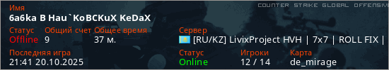Играет на Counter Strike Global Offensive сервере. Страна: КазахстанПервый раз замечен 20:51 09.10.2025
