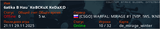 Играет на Counter Strike Global Offensive сервере. Страна: РоссияПервый раз замечен 20:46 29.11.2025