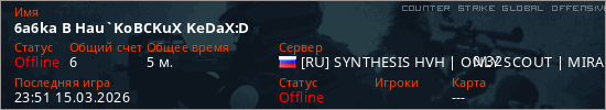 Играет на Counter Strike Global Offensive сервере. Страна: РоссияПервый раз замечен 23:20 15.03.2026