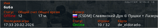 Играет на Counter Strike 1.6 сервере. Страна: РоссияПервый раз замечен 22:06 19.02.2026