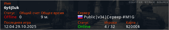Играет на Counter Strike Source сервере. Страна: РоссияПервый раз замечен 18:30 28.10.2025