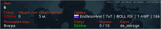Играет на Counter Strike Global Offensive сервере. Страна: РоссияПервый раз замечен 17:37 06.03.2026