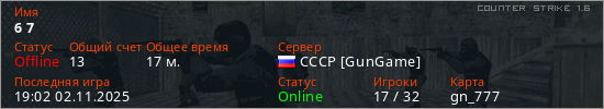 Играет на Counter Strike 1.6 сервере. Страна: РоссияПервый раз замечен 15:08 05.10.2025