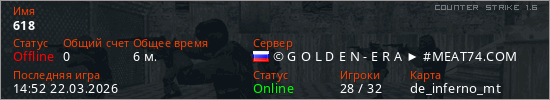 Играет на Counter Strike 1.6 сервере. Страна: РоссияПервый раз замечен 14:50 22.03.2026
