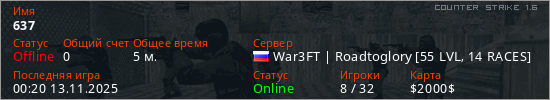 Играет на Counter Strike 1.6 сервере. Страна: РоссияПервый раз замечен 23:30 12.11.2025