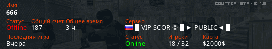 Играет на Counter Strike 1.6 сервере. Страна: РоссияПервый раз замечен 17:11 24.08.2025