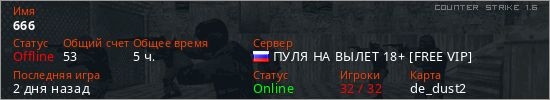Играет на Counter Strike 1.6 сервере. Страна: РоссияПервый раз замечен 08:01 01.07.2025