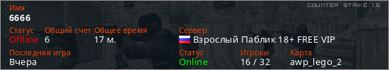 Играет на Counter Strike 1.6 сервере. Страна: РоссияПервый раз замечен 17:21 08.12.2025