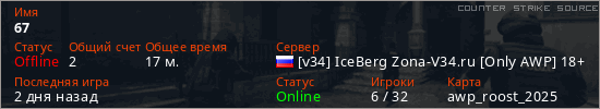 Играет на Counter Strike Source сервере. Страна: РоссияПервый раз замечен 15:23 27.12.2025